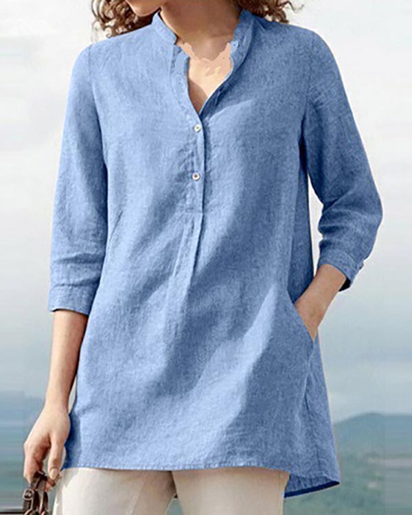 Solid Color Stand Collar Linen Casual Pullover Shirt Top