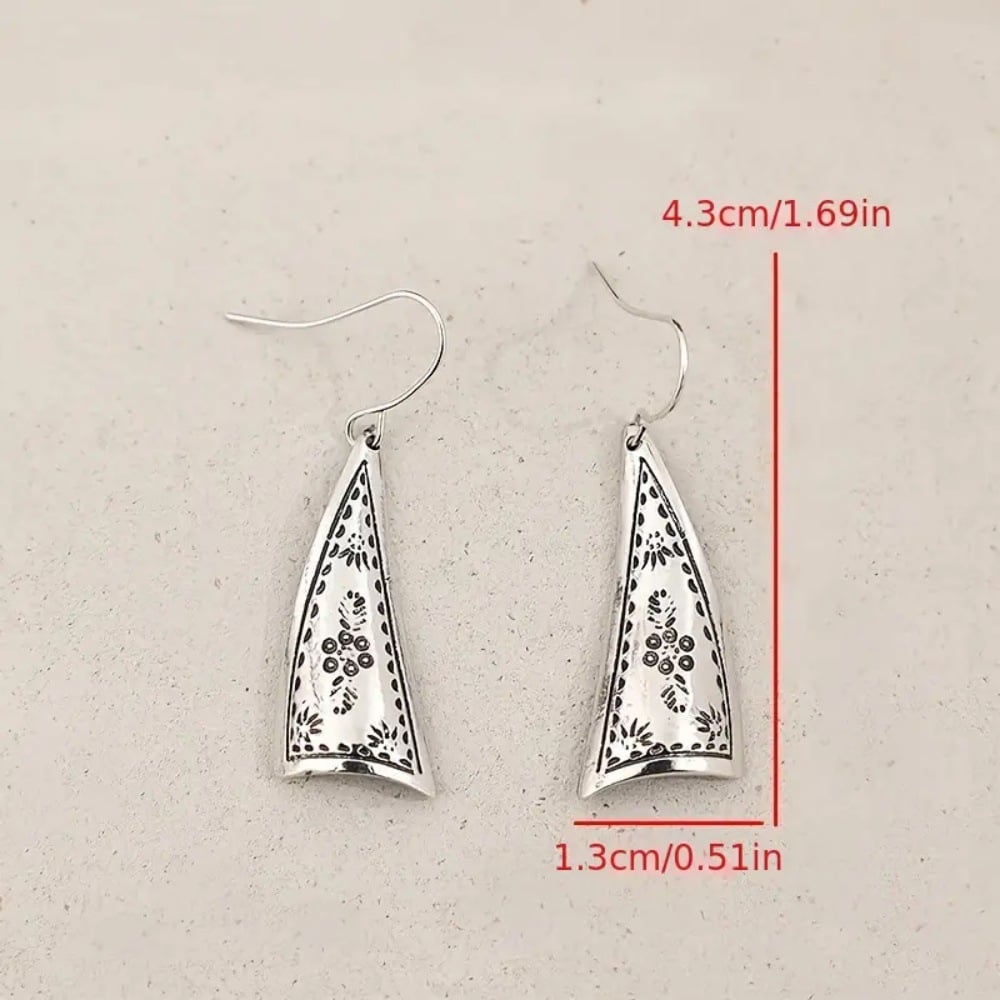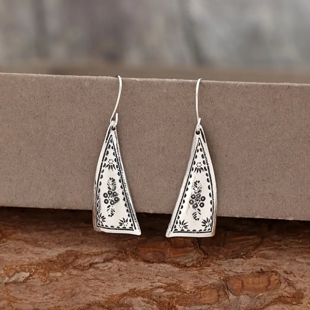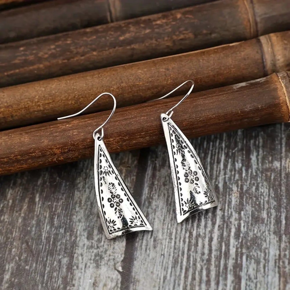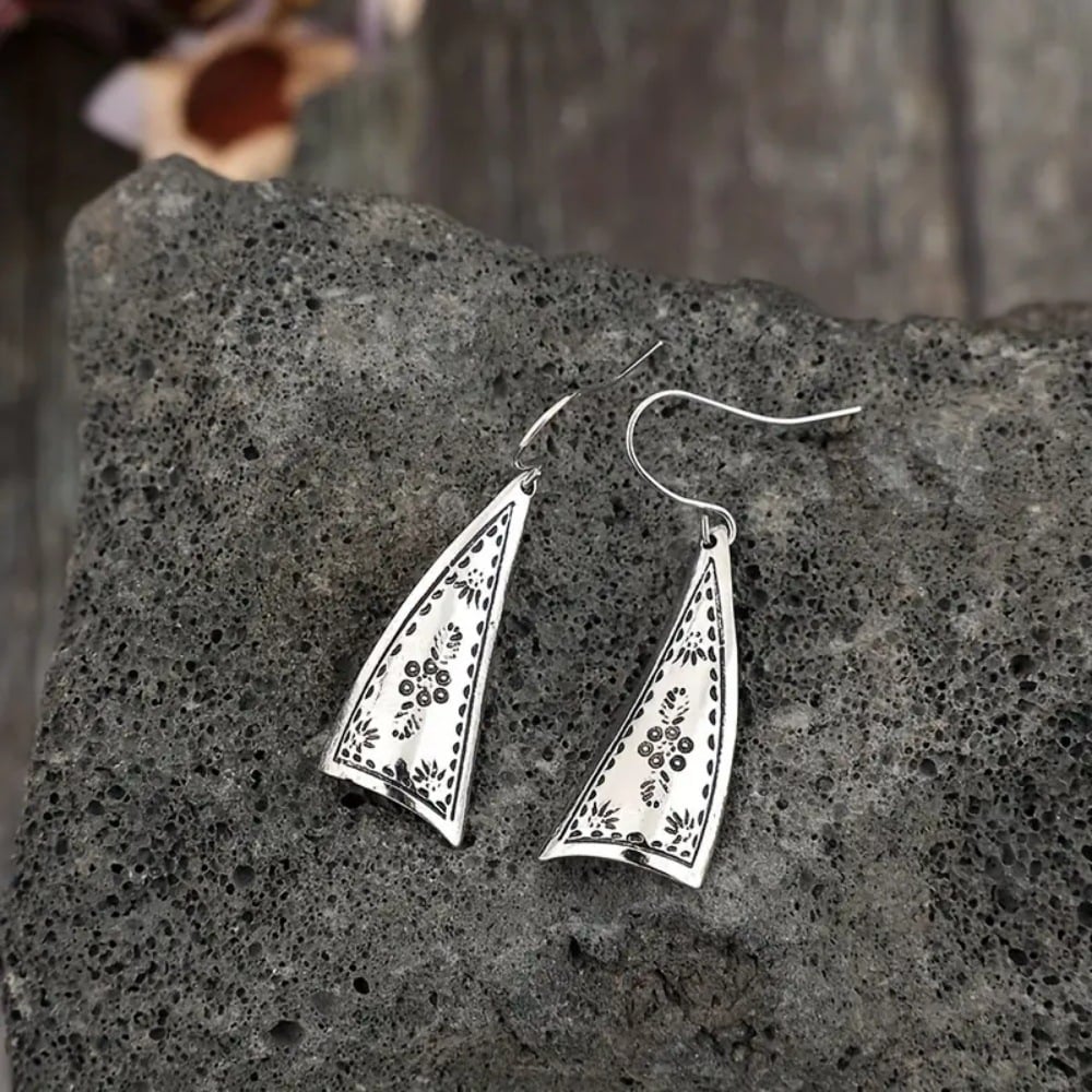 The earrings feature a unique asymmetric triangular silhouette. paired with intricate floral and vine engravings for a distinctly vintage. Bohemian feel. The blackened detailing enhances the carved patterns. giving them depth and character. Lightweight and perfectly balanced. these drops move gracefully with every step you take.