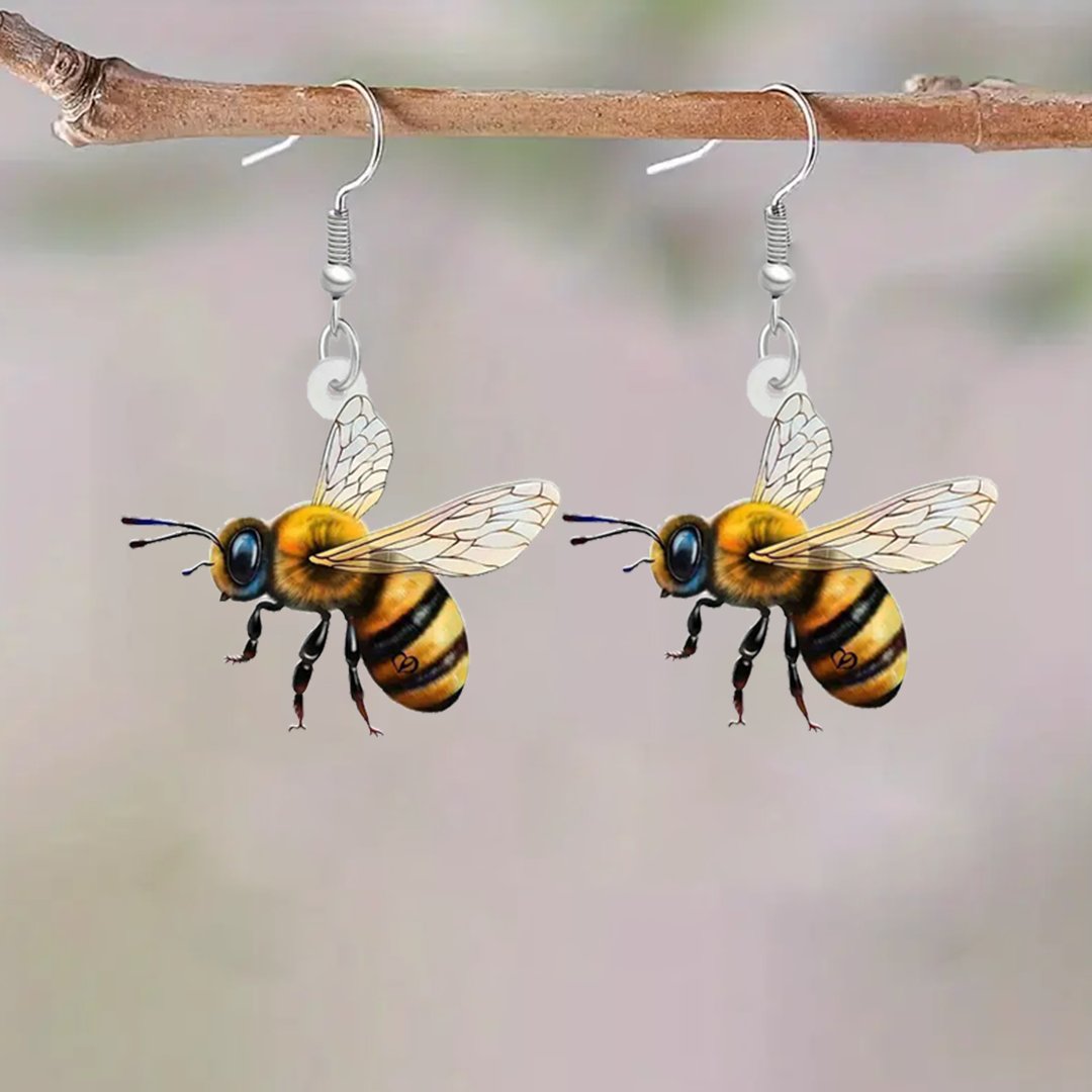 These earrings are crafted to capture the playful spirit and symbolic beauty of the honeybee. Each pair features delicately illustrated bee figures. ranging from realistic to whimsical styles.