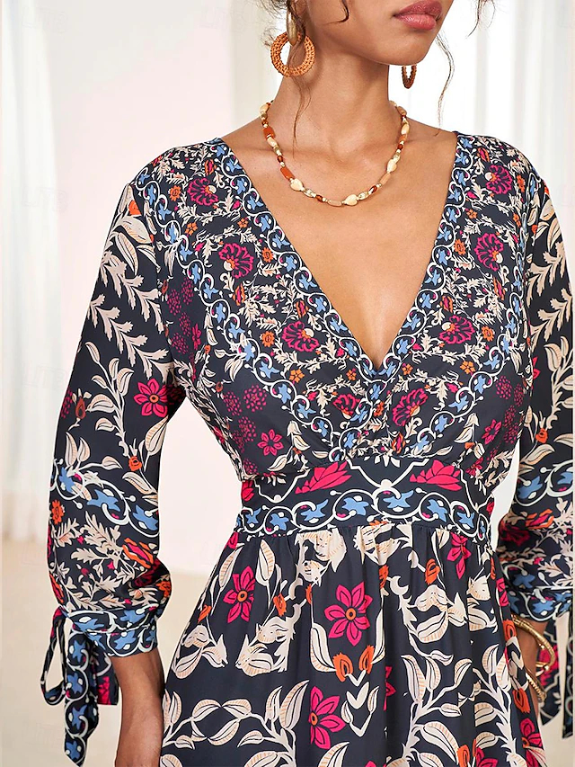 [Stunning Floral Boho Maxi Dress]: Crafted from lightweight polyester, this vibrant dress features a captivating floral pattern that perfectly embodies bohemian style. The deep V-neck design is complemented by puff sleeves with a delicate bow and ruffle details, adding a touch of romantic elegance.