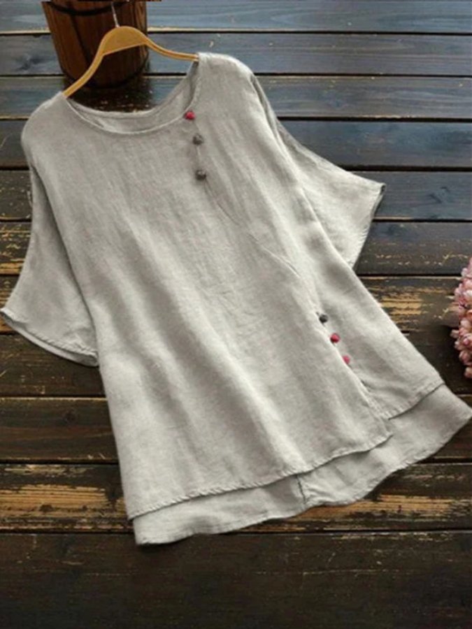 Women's Solid Cotton Linen Round Neck Split T-shirt