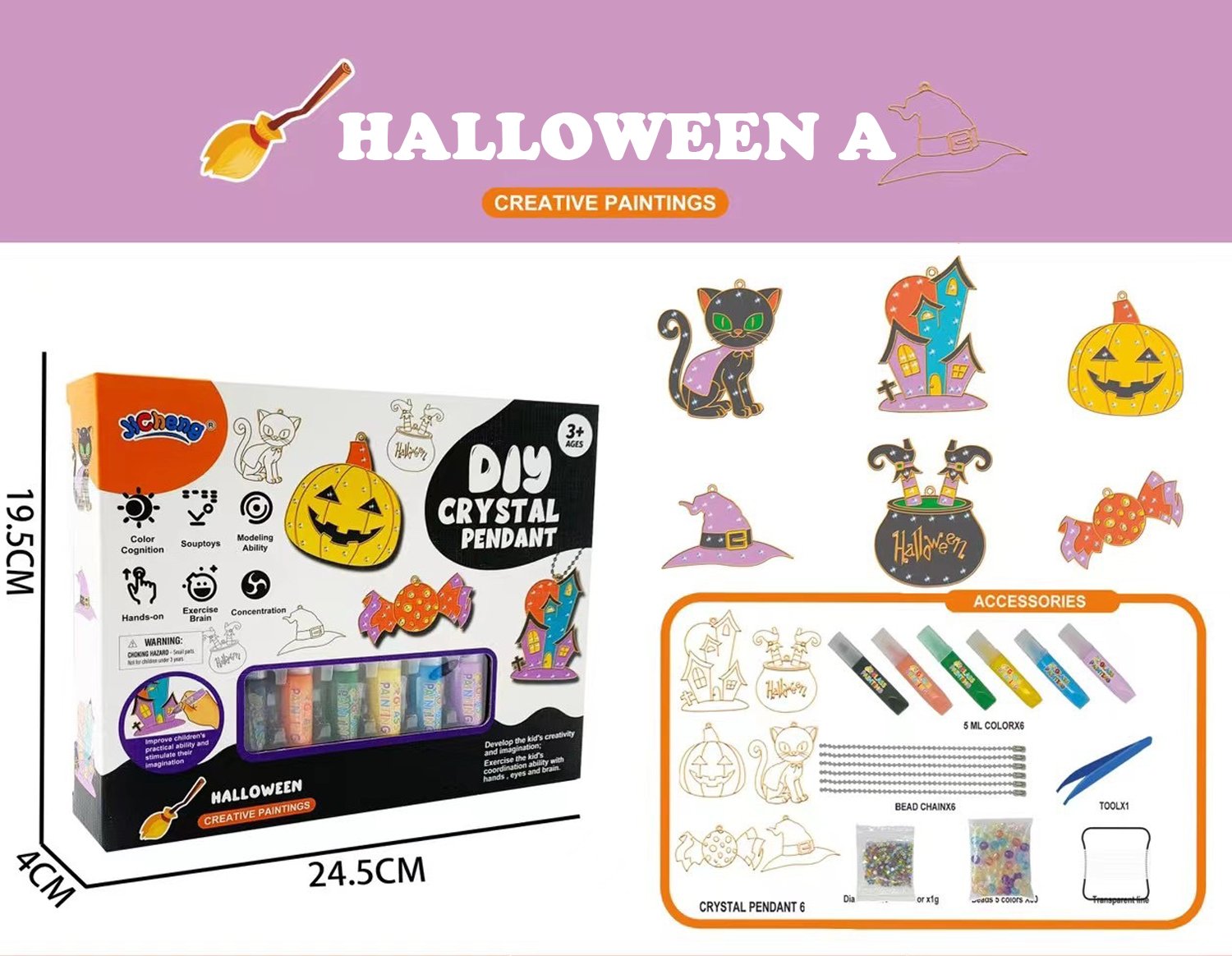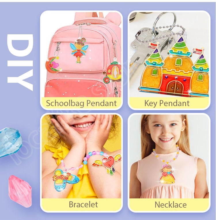 • Package Includes: 6 crystal pendants. 6 color paints. 6 chains. tweezers. 3 packs of diamonds. 1 pack of color beads. and 1 clothesline